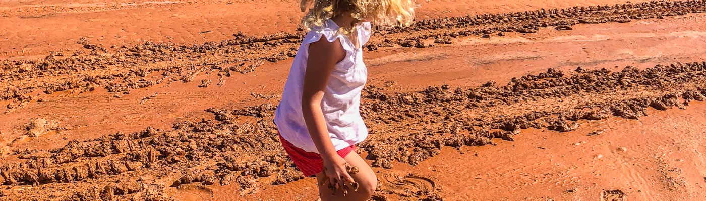 We have been able to share more closely in other ‘kids-will-be-kids’ experiences. Today, on our second travel day backtracking south to Monkey Mia, we pulled over for Baby Alice to have a feed and found ourselves surrounded by the stickiest, reddest and slipperiest mud imaginable. I knew that any attempted admonitions at cleanliness would likely be futile and, sure enough, after only a matter of minutes Mia was knee deep in the wet clay soil and cackling with unbridled joy. Olivia was a little bit more reluctant (in fact she was bordering on apologetic) but after I coaxed her into the action by assuring her that getting dirty was one of the best parts of being a kid, she was soon in the thick of it also. I think the photos tell the story far better than I can. Back in the car, with our upholstery taking a beating, half-an-hour or so later Olivia passed me a note without fanfare. I took one eye off the road for a second or two to read it. As I absorbed the contents of my eldest daughter’s spontaneous communication, this father’s heart was filled to overflowing. It read: “dear DaD being a KiD is amasing”.
